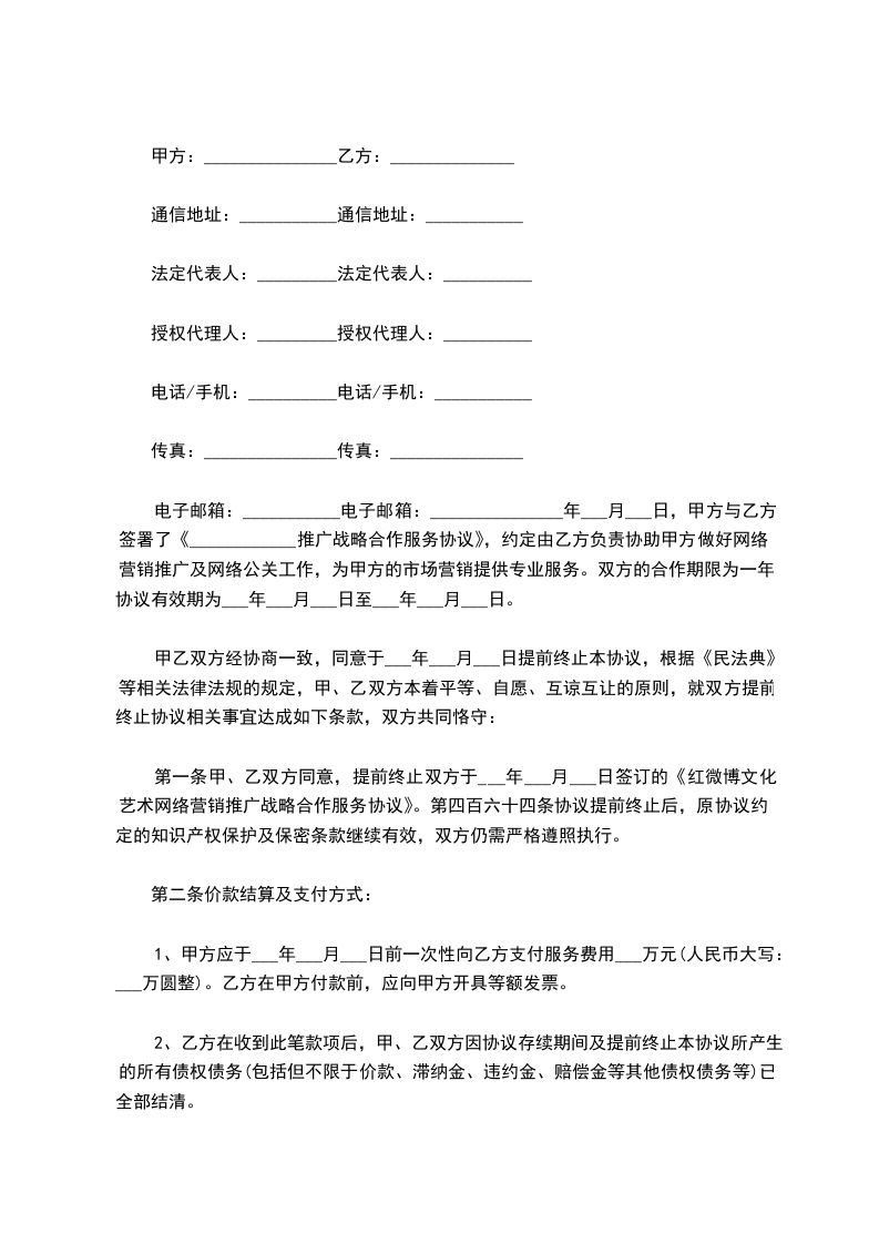 第一条甲、乙双方同意,提前终止双方于___年___月___日签订的《红微博文化艺术网络营销推广战略合作服务协议》。第四百六十四条协议提前终止后,原协议约定的知识产权保护及保密条款继续有效,双方仍需严格遵照执行。