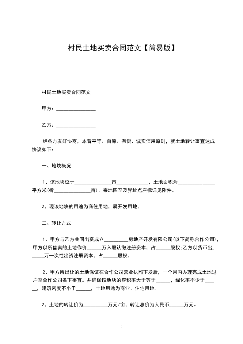 村民土地买卖合同范文