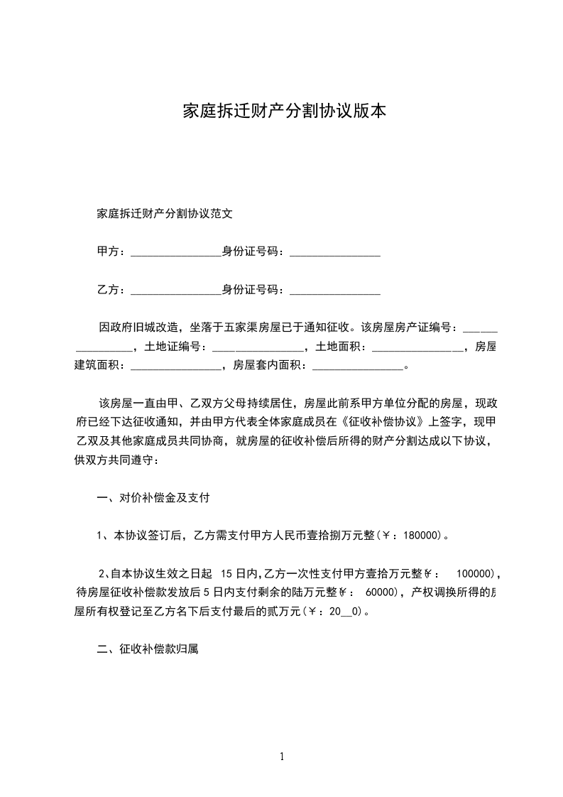 家庭拆迁财产分割协议范文
