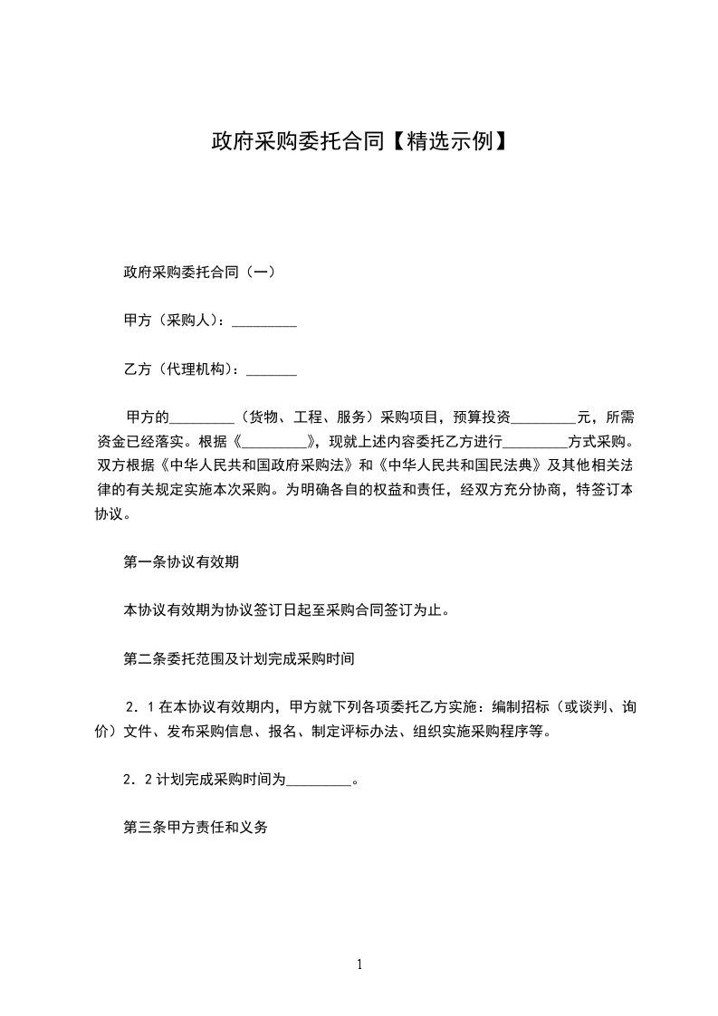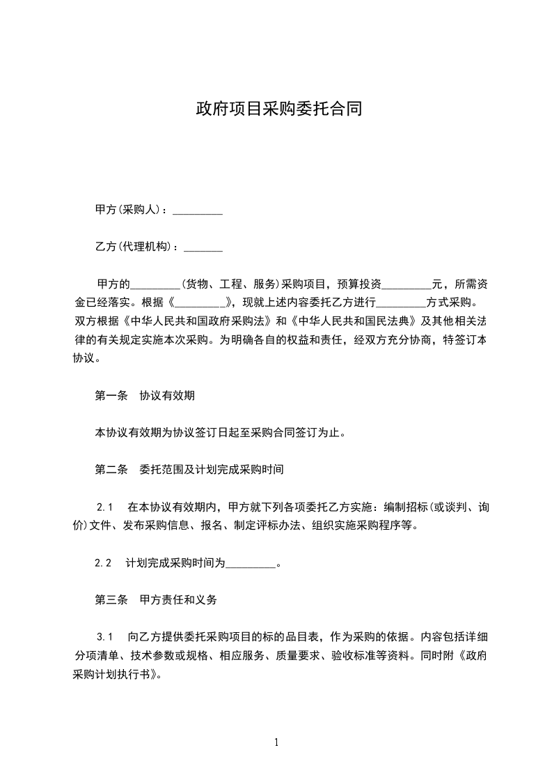 甲方的_________(货物、工程、服务)采购项目,预算投资_________元,所需资金已经落实。根据《_________》,现就上述内容委托乙方进行_________方式采购。双方根据《中华人民共和国政府采购法》和《中华人民共和国民法典》及其他相关法律的有关规定实施本次采购。为明确各自的权益和责任,经双方充分协商,特签订本协议。