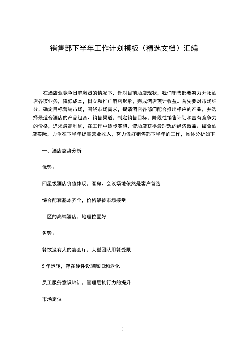 在酒店业竞争日趋激烈的情况下,针对目前酒店现状,我们销售部要努力开拓酒店各项业务,降低成本,树立和推广酒店形象,完成酒店预计收益。首先要对市场细分,确定目标营销市场,围绕市场需求,提请酒店各部门配合推出相应的产品,并选择最适合酒店的产品组合、销售渠道,制定销售目标、阶段性销售计划和富有竞争力的价格,追求最高利润,在工作中逐步实施,使酒店获得最理想的经济效益。结合酒店实际,力争在下半年提高营业收入,努力做好销售部下半年的工作,具体分析如下: