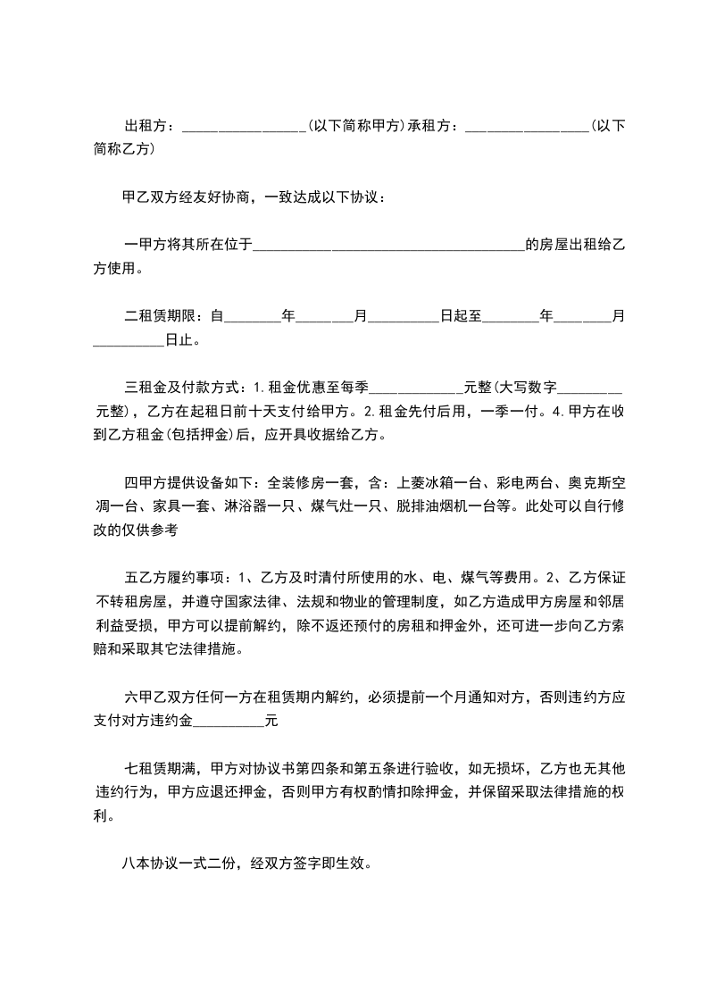 四甲方提供设备如下:全装修房一套,含:上菱冰箱一台、彩电两台、奥克斯空凋一台、家具一套、淋浴器一只、煤气灶一只、脱排油烟机一台等。此处可以自行修改的仅供参考