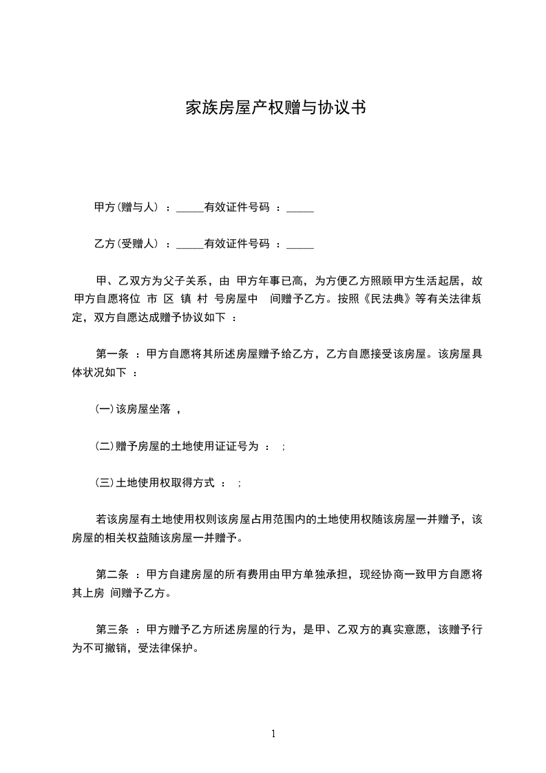 受赠人系赠与人之子,赠与人为了避免自己房屋产权今后的争议隐患,经与继承人的共同商定,将自己享有座落于腾越镇天成XX(房产证号:)的房屋产权赠与受赠人。现就相关事宜达成如下协议: