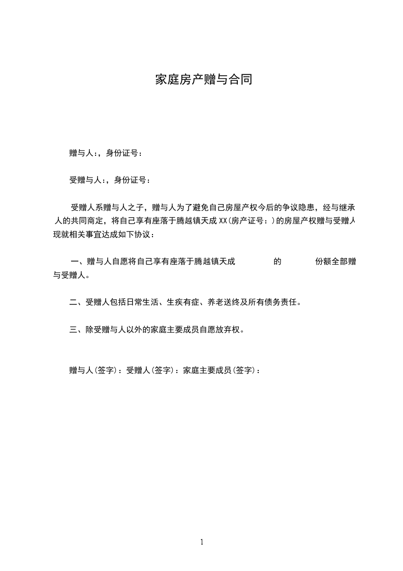 赠与人(签字):受赠人(签字):家庭主要成员(签字):