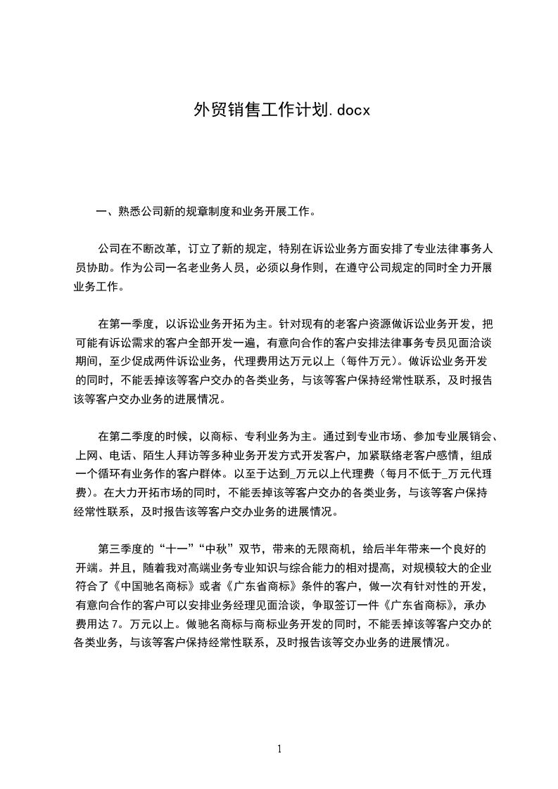 在第一季度,以诉讼业务开拓为主。针对现有的老客户资源做诉讼业务开发,把可能有诉讼需求的客户全部开发一遍,有意向合作的客户安排法律事务专员见面洽谈。期间,至少促成两件诉讼业务,代理费用达万元以上(每件万元)。做诉讼业务开发的同时,不能丢掉该等客户交办的各类业务,与该等客户保持经常性联系,及时报告该等客户交办业务的进展情况。