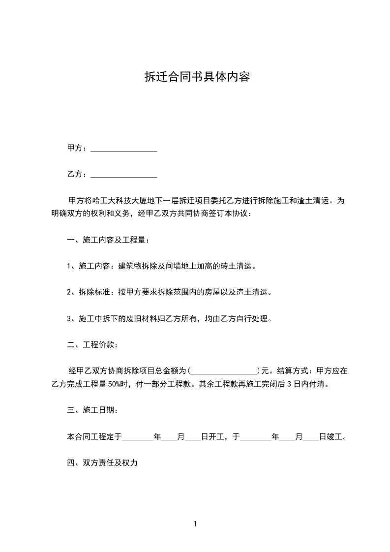 经甲乙双方协商拆除项目总金额为(_________________)元。结算方式:甲方应在乙方完成工程量50%时,付一部分工程款。其余工程款再施工完闭后3日内付清。
