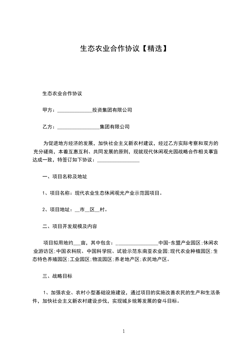 为促进地方经济的发展,加快社会主义新农村建议,经过乙方实际考察和双方的充分磋商,本着互惠互利、共同发展的原则,现就现代休闲观光园战略合作相关事宜达成一致,特签订如下协议:_________________