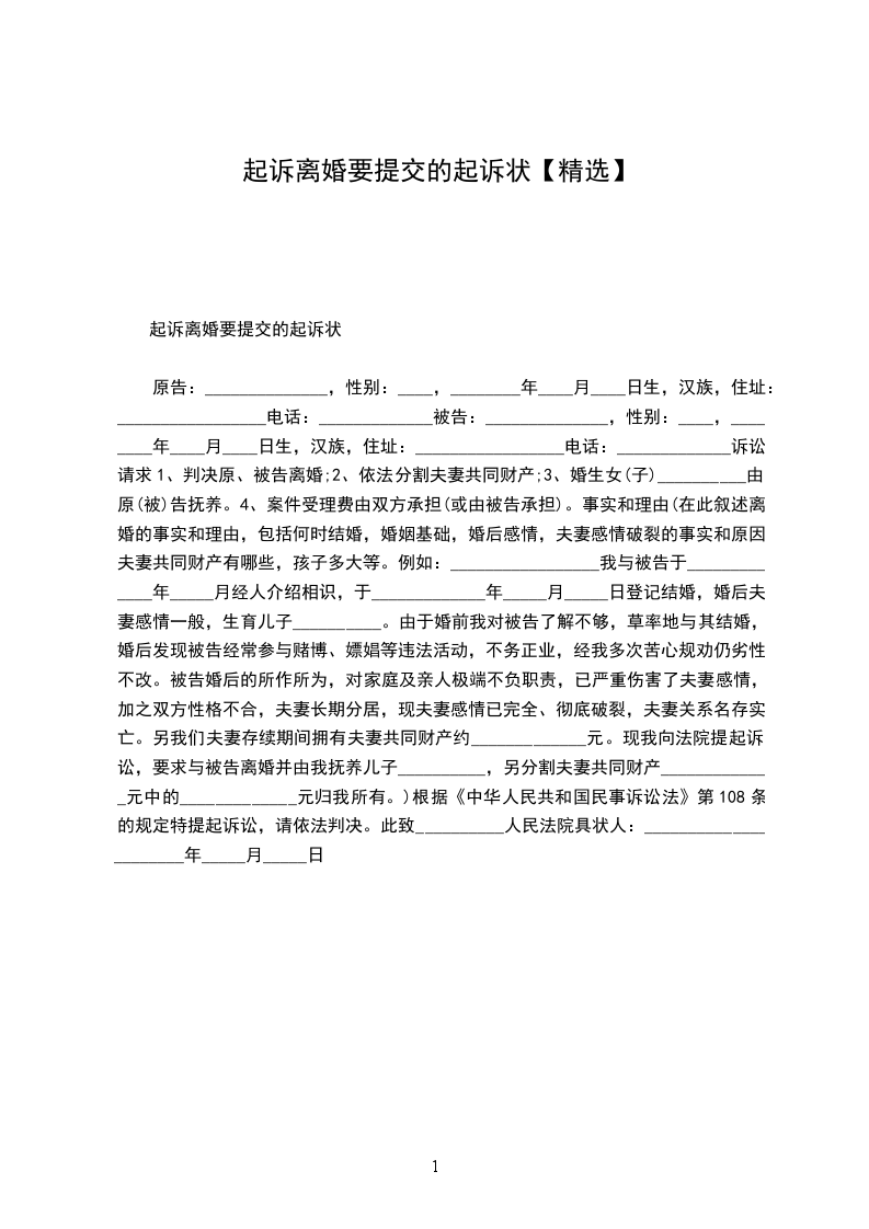 起诉离婚要提交的起诉状