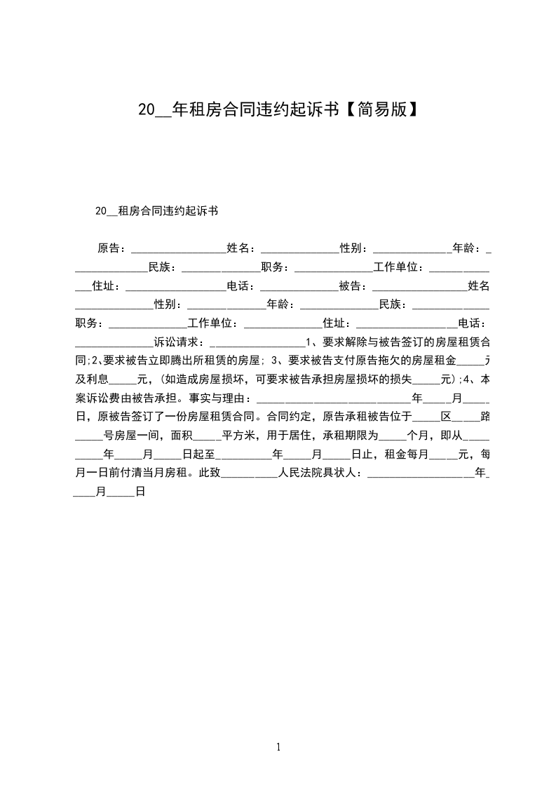 20__租房合同违约起诉书