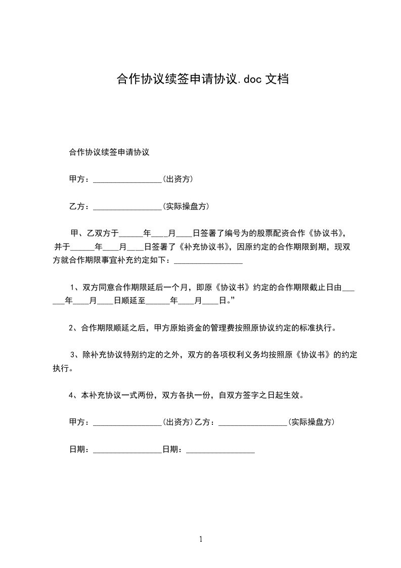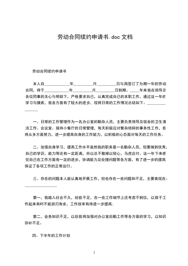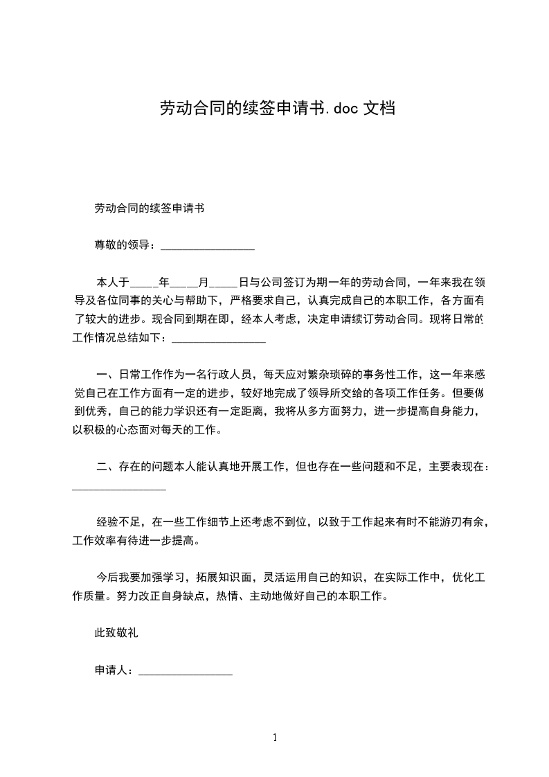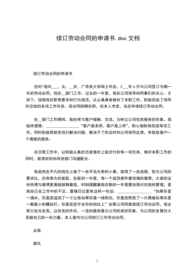 单位领导:我叫_______________,女,__________岁,大专文化,_____________年__________月与贵单位签订为期两年的劳动合同,现在贵单位_____________营业所上班。两年来,我在单位、领导和同事们的关心、支持下,按照岗位职责要求和行为规范,认认真真地做好了本职工作,较好地完成了领导所交给的各项工作任务。现合同到期在即,经本人考虑,决定申请续订劳动合同,其理由有二:一是合同期内,以优质的服务树立了良好的对外形象。我在_______________营业所上班。由于该所地处闹市,因此,上班时间工作之忙,业务量之大是可想而知的。但为树立单位优质服务的形象,我始终牢记贵单位的服务宗旨,总是做到早上班、迟下班,耐心细致地数好每一分钱,给客户一个满意的服务。由于我工作认真、过细,两年来不仅未发生一笔误差,未与客户发生一起争吵,而且因我的优质服务,赢得了客户的满意和信任。二是合同期内,以顽强的毅力提高了个人的自身素质。两年来,在爱人的支持下,工作之余,我总是主动放弃休息和娱乐时间,抛开繁琐的家务,集中精力,积极主动地抓好业务学习,不断为自己“充电加油”,以使个人业务素质适应不断发展变化的新形势。现在,五笔打字,ABIS操作等项业务工作我都烂熟于胸,操作流利。另外,对其它与工作相关的业务,我也是努力学习,尽快掌握。两年来,我个人在当班期间,没有发生一起因业务不熟而被难住、以致耽误客户时间的事件。两年来,我虽然在平凡的岗位上做了一些平淡无奇的小事,取得了一些成绩,但与贵单位的要求比,还有很大的差距。今后,如果贵单位同意我续订劳动合同,我将更加努力学习,更加发奋工作,用优良的作风、一流的服务展示单位的美好形象。此致敬礼申请人:_________________年__________月__________日