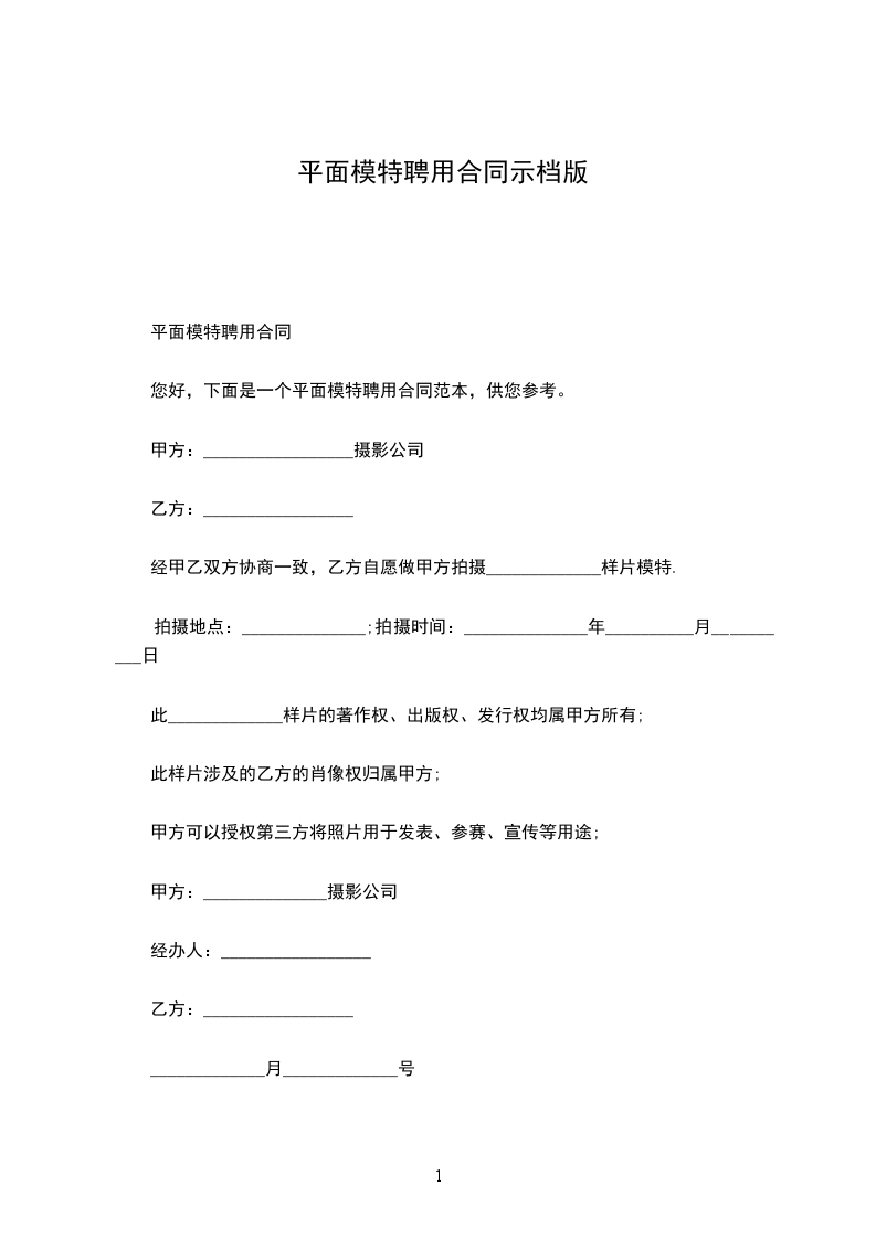 您好,下面是一个平面模特聘用合同范本,供您参考。