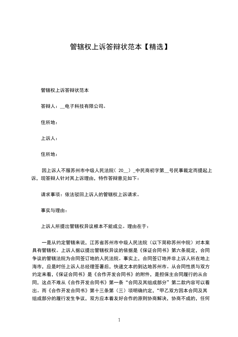 管辖权上诉答辩状范本