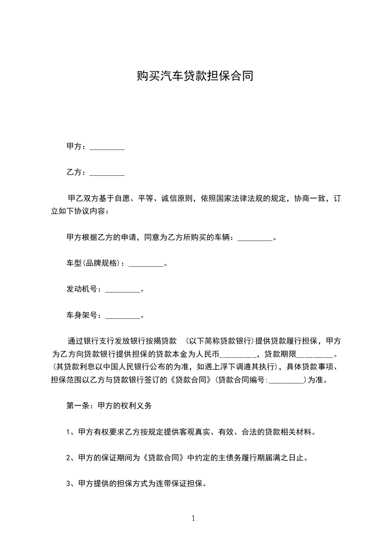 1、甲方向____________银行(请将具体银行名称写清楚)(以下简称贷款银行)申请购车贷款购买汽车从事工作、生活需要,并委托乙方为其汽车贷款提供保证担保,乙方同意为甲方汽车贷款提供保证担保服务。