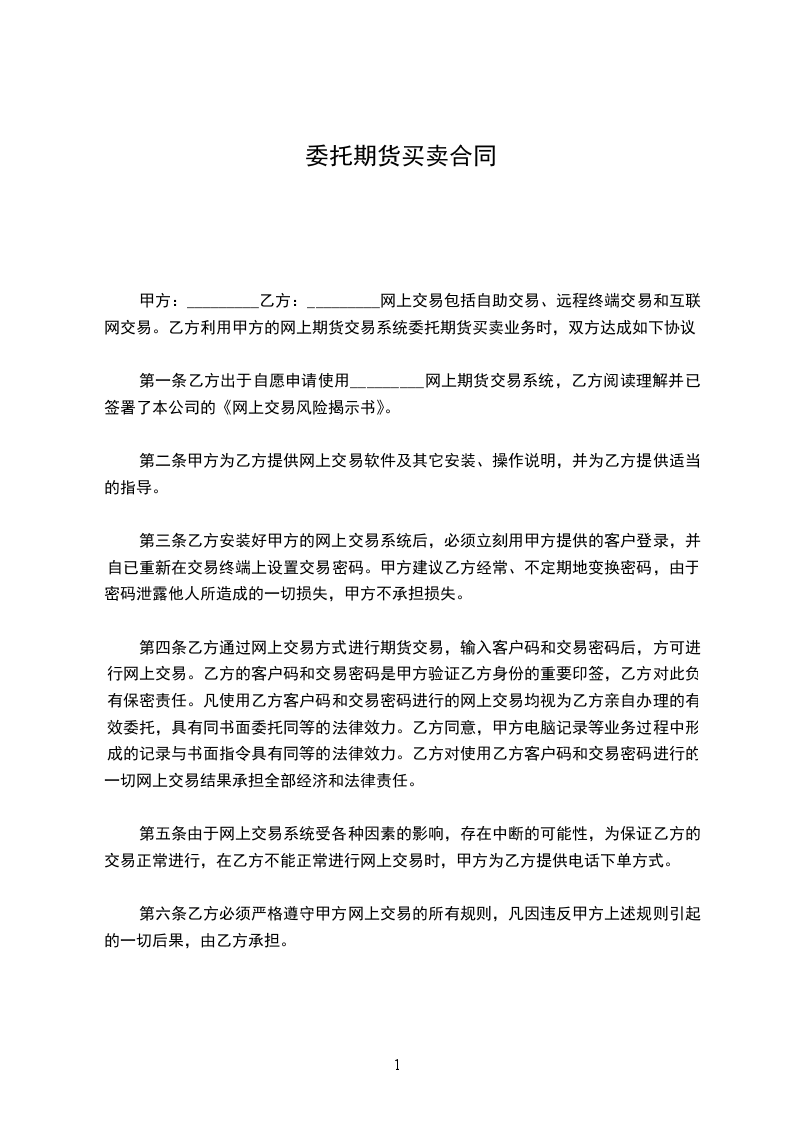 1.有关委托的期货买卖,概由贵公司代理本人与对方的当事人订立契约,或由贵公司再行委托代理人与对方当事人订立契约。