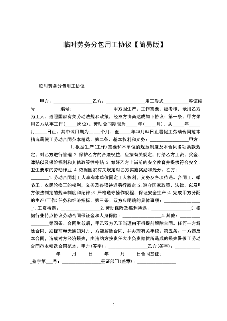 甲方:_________________乙方:_________________用工形式___________鉴证编号___________编号:_________________甲方因生产、工作需要,经考核,录用乙方为工人。遵照国家有关劳动法规和政策,经双方协商达成如下协议:第一条、甲方录用乙方从事工作(_____岗位)。劳动合同期限为_____年(_____月),从_____年_____月_____日止。其中试用期为_____个月,至_____年##月##日止暑假工劳动合同范本精选暑假工劳动合同范本精选。第二条、基本权利和义务:_________________甲方:_________________1.根据生产(工作)需要和本单位的规章制度及本合同各项条款规定,对乙方进行管理;2.保护乙方的合法权益,应按有关规定,付给乙方工资、奖金、津贴以及保险福利和其他政策性补贴;3.做好乙方上岗前的安全教育并提供符合安全、卫生要求的劳动作业;4.依据国家有关规定对乙方实施奖励和处分。乙方:_________________1.劳动合同制工人享有本单位固定工人权利,义务及各项待遇。合同工、季节工、农民轮换工的权利,义务及各项待遇另行商定;2.遵守国家政策、法律,以及甲方依法制定的规章制度和纪律;3.严格遵守操作规程,保证安全生产;4.完成甲方分配的生产(工作)任务和经济指标。第三条、双方应明确的具体事项:_________________1.工资待遇:_________________2.劳动保险及福利待遇:_________________3.根据行业特点协议劳动合同保证金和人身保险:_________________4.其他:_________________第四条、合同生效后,甲乙双方无正当理由不得提前解除合同。任何一方解除合同,须提前##天通知对方,方能解除合同,并办理有关手续。第五条、一方违反本合同,造成对方经济损失,由违约方按责任大小负责赔偿所造成的损失暑假工劳动合同范本精选合同范本。甲方(签字):_________________乙方(签字):______________________年_____月_____日_____年_____月_____日合同签证:_________________鉴字第___号:_________________签证部门(盖章):_________________
