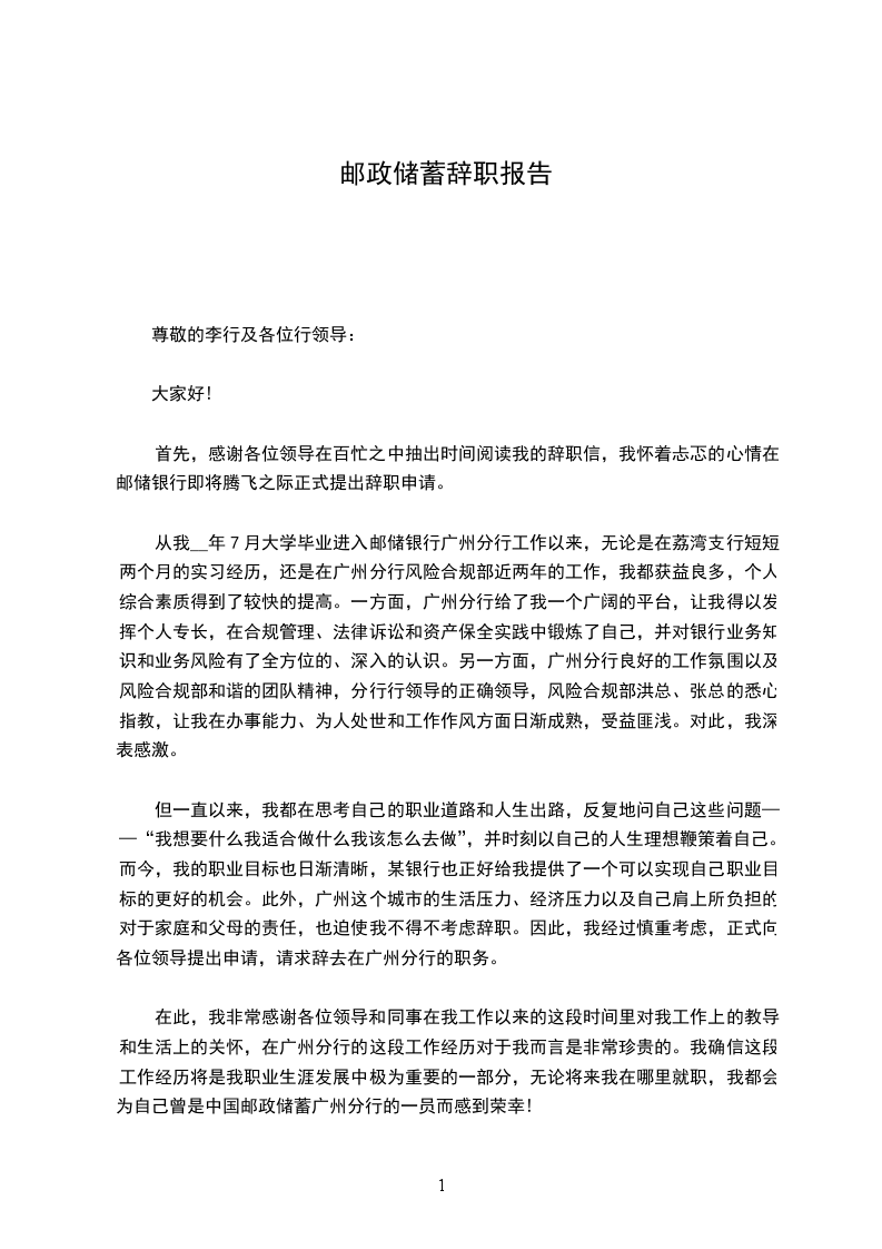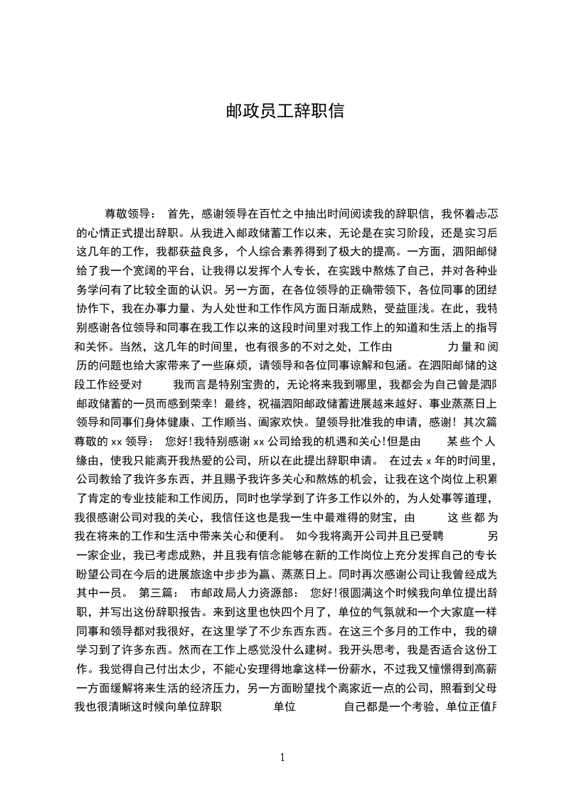 我带着复杂的心情写这封辞职信。来到邮政已经有半年多的时间,正是在这里我开始踏上了社会,完成了自己从一个学生到社会人的转变。这半年多时间里,我大部分时间在基层锻炼,先后在储蓄、包裹等岗位学习,每位领导对我的工作都很支持,让我从中学到很多为人处事的方式和业务知识,从中积累了很宝贵的经验,非常感谢各位领导对我的关照。