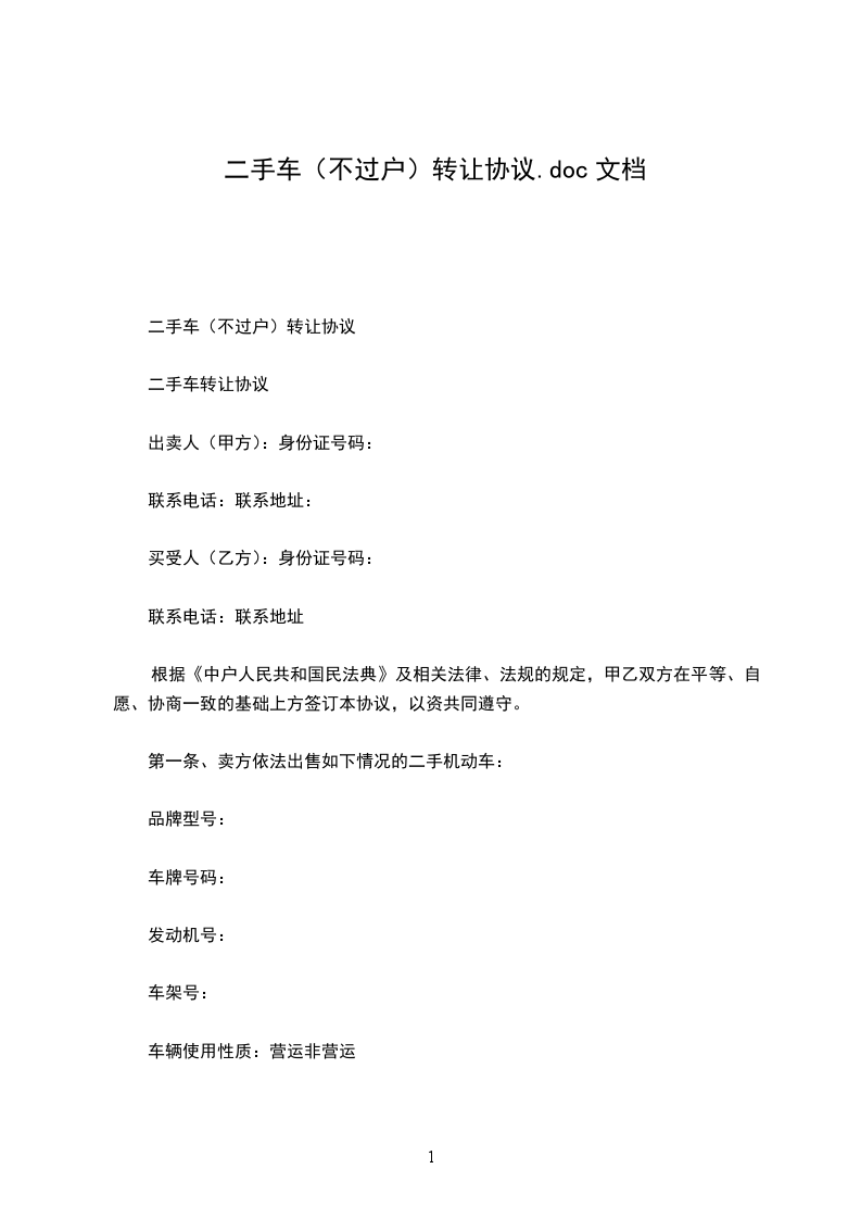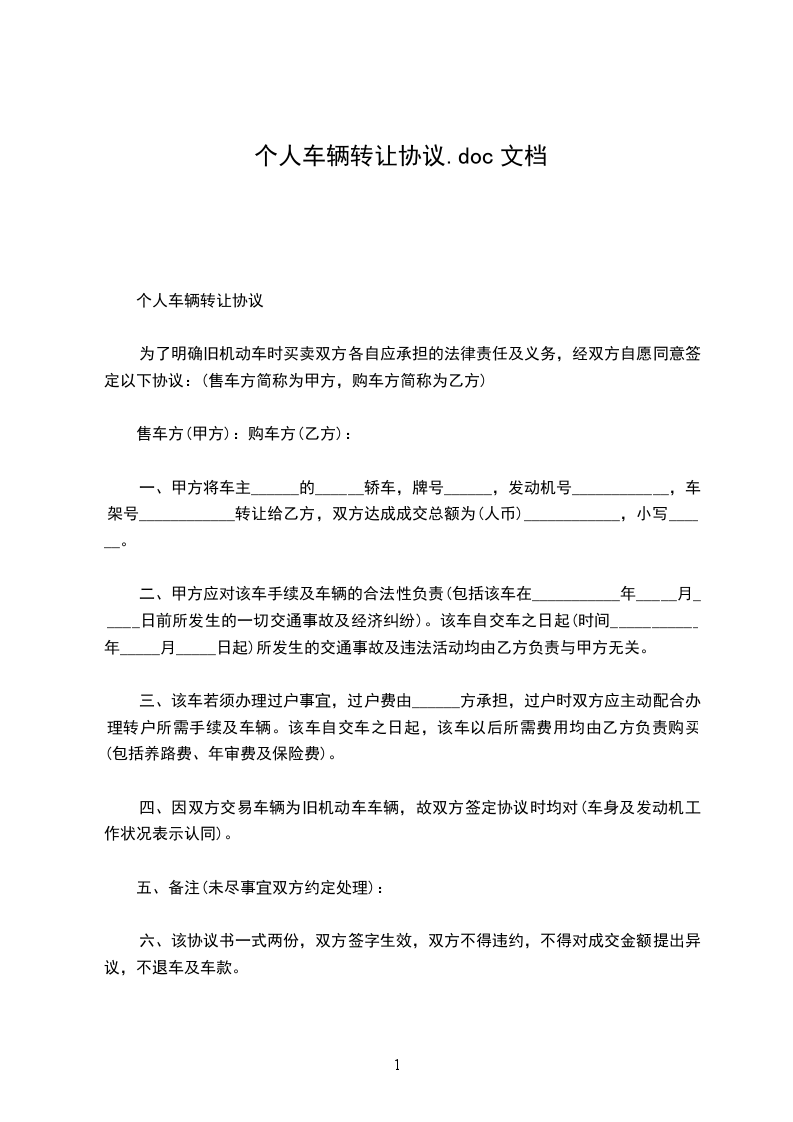 一、甲方将车主的轿车,牌号,发动机号,车架号转让给乙方,双方达成成交总额为(人币),小写。