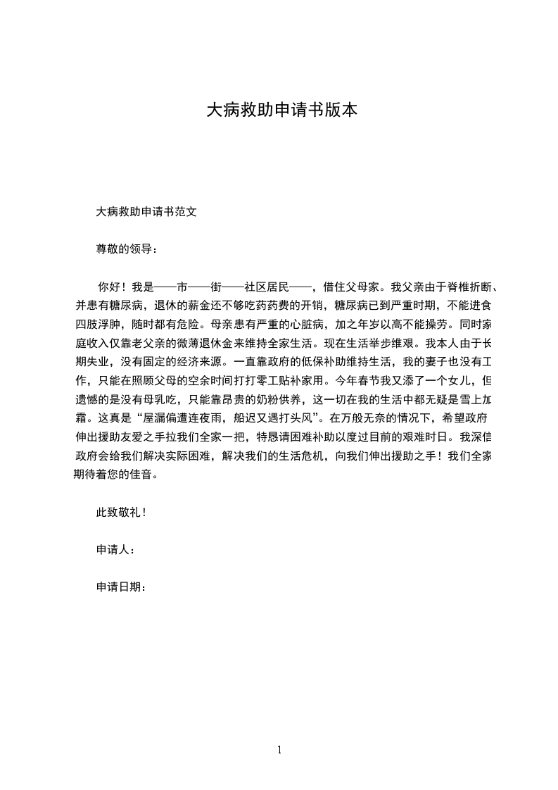 你好!我是——市——街——社区居民——,借住父母家。我父亲由于脊椎折断、并患有糖尿病,退休的薪金还不够吃药药费的开销,糖尿病已到严重时期,不能进食,四肢浮肿,随时都有危险。母亲患有严重的心脏病,加之年岁以高不能操劳。同时家庭收入仅靠老父亲的微薄退休金来维持全家生活。现在生活举步维艰。我本人由于长期失业,没有固定的经济来源。一直靠政府的低保补助维持生活,我的妻子也没有工作,只能在照顾父母的空余时间打打零工贴补家用。今年春节我又添了一个女儿,但遗憾的是没有母乳吃,只能靠昂贵的奶粉供养,这一切在我的生活中都无疑是雪上加霜。这真是“屋漏偏遭连夜雨,船迟又遇打头风”。在万般无奈的情况下,希望政府伸出援助友爱之手拉我们全家一把,特恳请困难补助以度过目前的艰难时日。我深信政府会给我们解决实际困难,解决我们的生活危机,向我们伸出援助之手!我们全家期待着您的佳音。