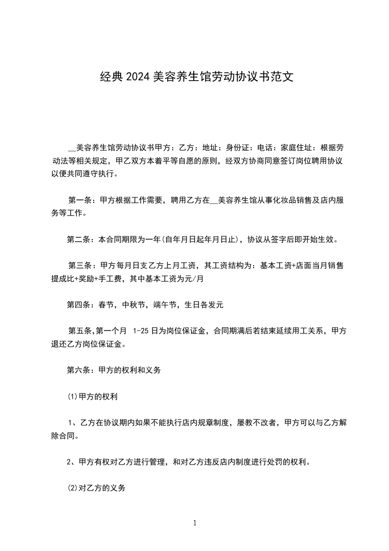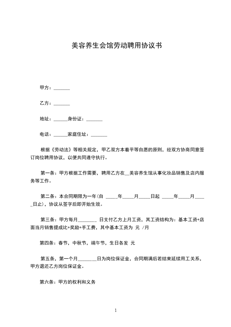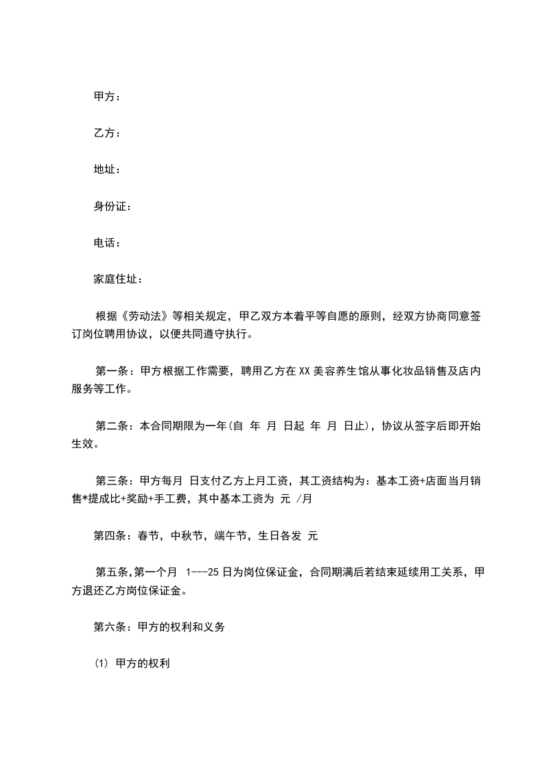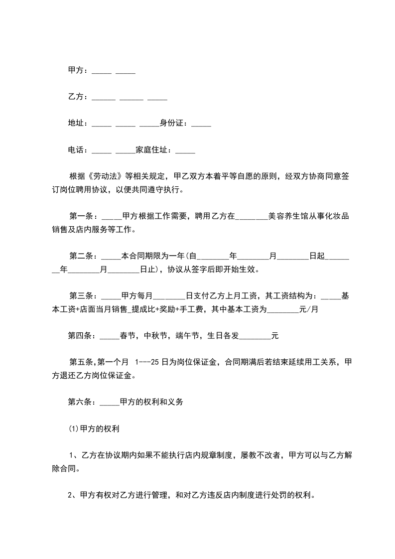 第一条:甲方根据工作需要,聘用乙方在XX美容养生馆从事化妆品销售及店内服务等工作。