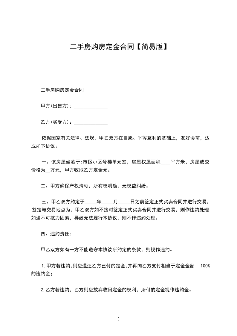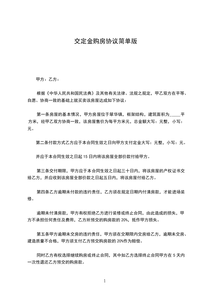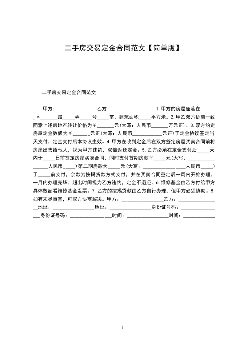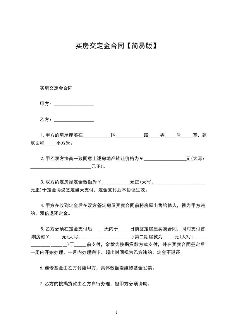 甲方:_________________乙方:_________________1.甲方的房屋座落在_______区_______路_____弄_____号_____室,建筑面积_____平方米。2.甲乙双方协商一致同意上述房地产转让价格为¥_______元(大写:人民币_______万元正)。3.双方约定房屋定金数额为¥_______元正(大写:人民币____________元正)于定金协议签定当天支付,定金支付后本协议生效。4.甲方在收到定金后在双方签定房屋买卖合同前将房屋出售给他人,视为甲方违约,双倍返还定金。5.乙方必须在定金支付后_____天内于_____日前签定房屋买卖合同,同时支付首期房款¥_____元(大写:_________________人民币_____)第二期房款为_____元(大写:_________________人民币_____)于_____前支付,余款为按揭贷款方式支付,并在买卖合同签定后一周内开始办理,一月内办理完毕。超出时间视为乙方违约,定金不退还。6.维修基金由乙方付给甲方,具体数额看维修基金发票。7.乙方的按揭贷款由乙方自行办理,但甲方必须协助。8.如有未尽事宜,可双方协商解决。甲方:_________________乙方:_________________地址:_________________地址:_________________身份证号码:_________________身份证号码:_________________时间:_________________时间:_________________