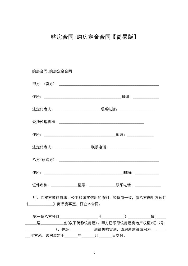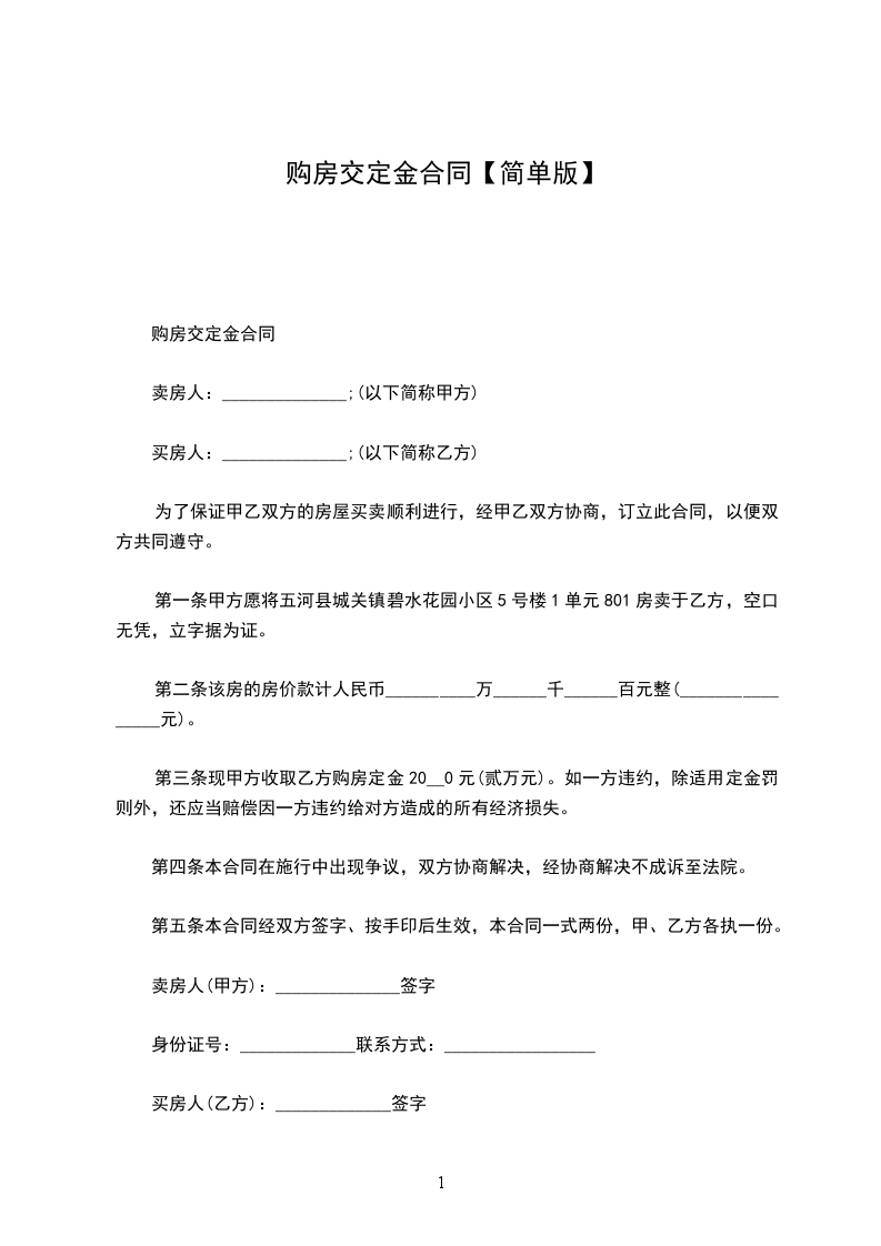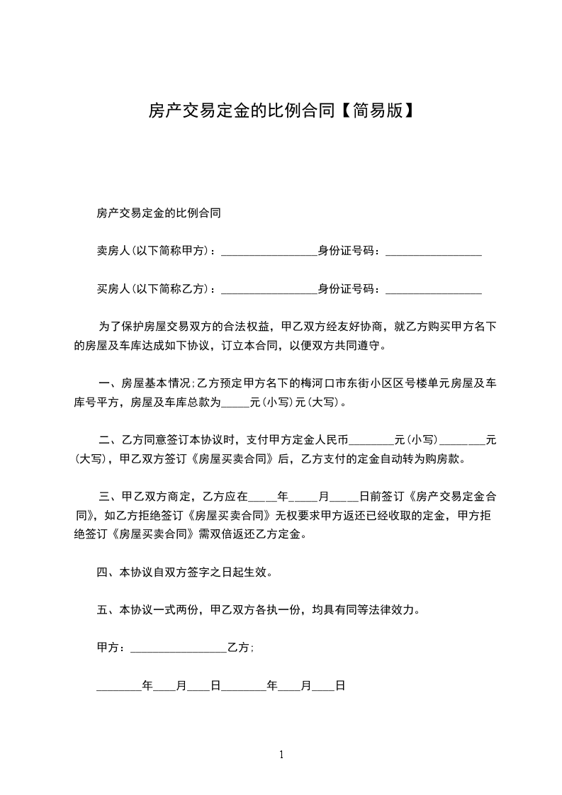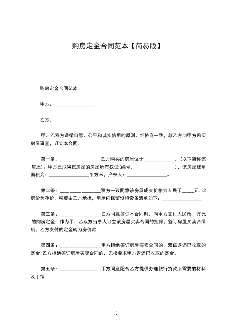 甲方:_________________乙方:_________________1.甲方的房屋座落在_______区_______路_____弄_____号_____室,建筑面积_____平方米。2.甲乙双方协商一致同意上述房地产转让价格为¥_______元(大写:人民币_______万元正)。3.双方约定房屋定金数额为¥_______元正(大写:人民币____________元正)于定金协议签定当天支付,定金支付后本协议生效。4.甲方在收到定金后在双方签定房屋买卖合同前将房屋出售给他人,视为甲方违约,双倍返还定金。5.乙方必须在定金支付后_____天内于_____日前签定房屋买卖合同,同时支付首期房款¥_____元(大写:_________________人民币_____)第二期房款为_____元(大写:_________________人民币_____)于_____前支付,余款为按揭贷款方式支付,并在买卖合同签定后一周内开始办理,一月内办理完毕。超出时间视为乙方违约,定金不退还。6.维修基金由乙方付给甲方,具体数额看维修基金发票。7.乙方的按揭贷款由乙方自行办理,但甲方必须协助。8.如有未尽事宜,可双方协商解决。甲方:_________________乙方:_________________地址:_________________地址:_________________身份证号码:_________________身份证号码:_________________时间:_________________时间:_________________