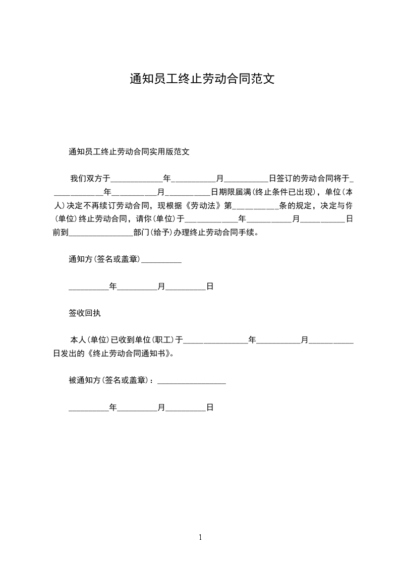 我们双方于_____________年___________月___________日签订的劳动合同将于_____________年___________月___________日期限届满(终止条件已出现),单位(本人)决定不再续订劳动合同,现根据《劳动法》第___________条的规定,决定与你(单位)终止劳动合同,请你(单位)于_____________年___________月___________日前到________________部门(给予)办理终止劳动合同手续。