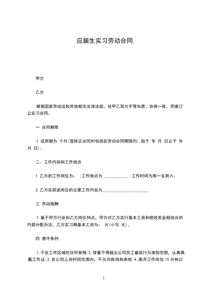 1.基于甲方行业和乙方岗位特点,甲方对乙方实行基本工资和绩效奖金相结合的内部分配办法,乙方实习期基本工资为: 元(小写 元)。