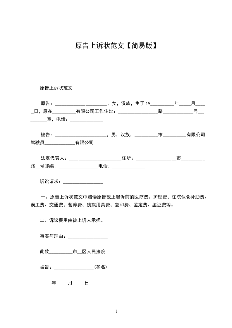 一、原告上诉状范文中赔偿原告截止起诉前的医疗费、护理费、住院伙食补助费、误工费、交通费、营养费、残疾用具费、复印费、鉴定费、鉴证费等。