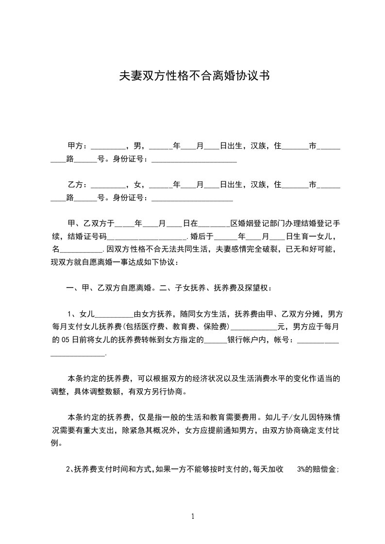 甲、乙双方于_____年____月____日在________区婚姻登记部门办理结婚登记手续,结婚证号码____________________.婚后于______年____月____日生育一女儿,名___________.因双方性格不合无法共同生活,夫妻感情完全破裂,已无和好可能,现双方就自愿离婚一事达成如下协议: