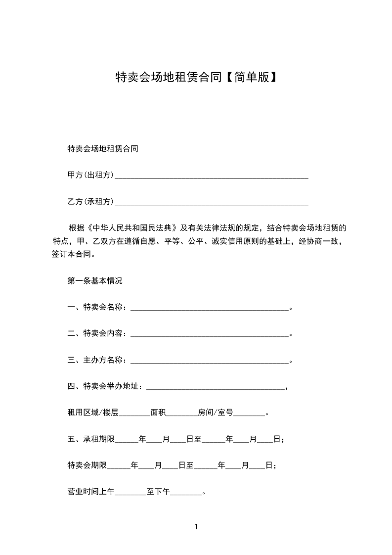 根据《中华人民共和国民法典》及有关法律法规的规定,结合特卖会场地租赁的特点,甲、乙双方在遵循自愿、平等、公平、诚实信用原则的基础上,经协商一致,签订本合同。