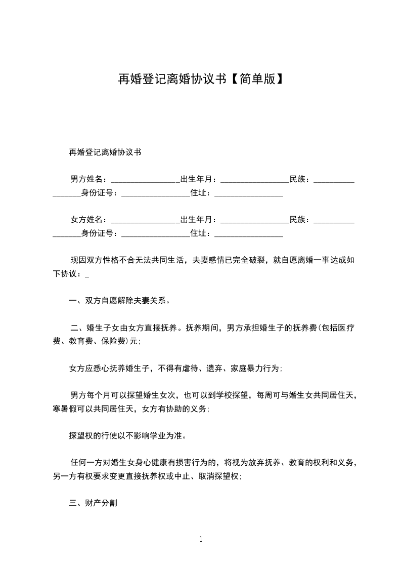 双方于__________年_____月认识,于__________年_____月_____日在__________登记结婚,婚后于__________年_____月_____日生育一儿子(女儿),名__________。现夫妻感情已经完全破裂,没有和好可能,经双方协商达成一致意见,订立离婚协议如下:_________________
