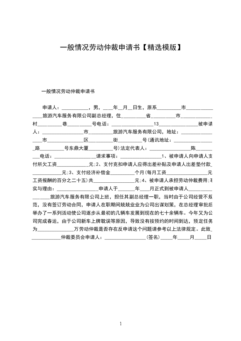 一般情况劳动仲裁申请书