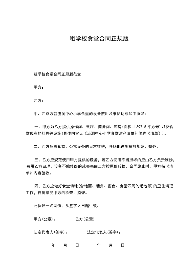 一、甲方为乙方提供操作间、餐厅、储备间、库房(面积共897.5平方米)以及食堂现有的灶具等设施(具体内容见《流洞中心小学食堂财产清单》简称《清单》)。