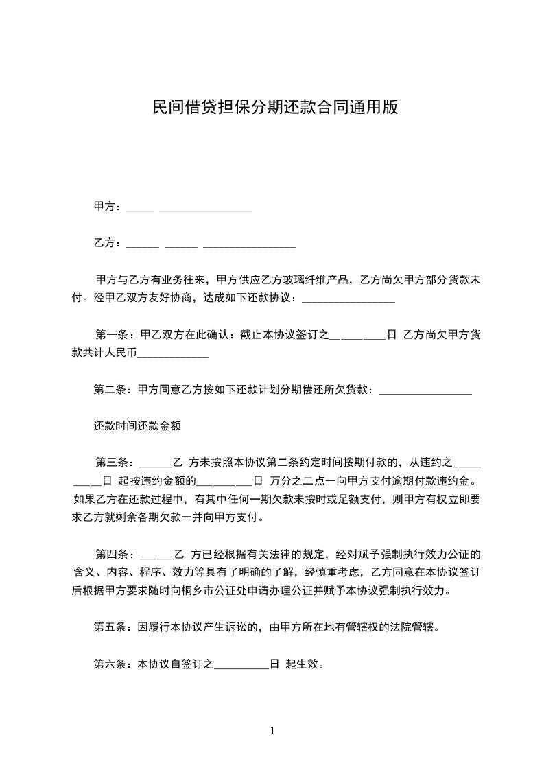 甲方:_________________乙方:_________________甲方与乙方有业务往来,甲方供应乙方玻璃纤维产品,乙方尚欠甲方部分货款未付。经甲乙双方友好协商,达成如下还款协议:_________________第一条:甲乙双方在此确认:截止本协议签订之日乙方尚欠甲方货款共计人民币_____________第二条:甲方同意乙方按如下还款计划分期偿还所欠货款:_________________还款时间还款金额第三条:乙方未按照本协议第二条约定时间按期付款的,从违约之日起按违约金额的日万分之二点一向甲方支付逾期付款违约金。如果乙方在还款过程中,有其中任何一期欠款未按时或足额支付,则甲方有权立即要求乙方就剩余各期欠款一并向甲方支付。第四条:乙方已经根据有关法律的规定,经对赋予强制执行效力公证的含义、内容、程序、效力等具有了明确的了解,经慎重考虑,乙方同意在本协议签订后根据甲方要求随时向桐乡市公证处申请办理公证并赋予本协议强制执行效力。第五条:因履行本协议产生诉讼的,由甲方所在地有管辖权的法院管辖。第六条:本协议自签订之日起生效。第七条:_本协议一式二份,甲乙双方各持一份,具有同等法律效力。甲方:_________________乙方:_________________签订日期:_________________签订日期:_________________