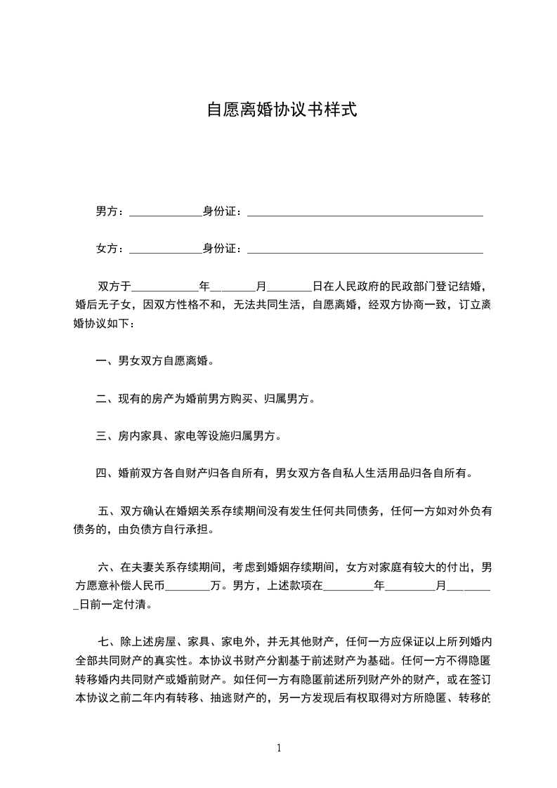 双方自愿离婚,互不对对方进行经济帮助,也不对对方进行精神赔偿和补偿。(需要补偿的,约定补偿金额)