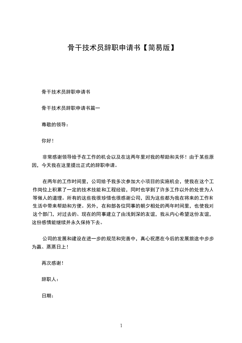 骨干技术员辞职申请书