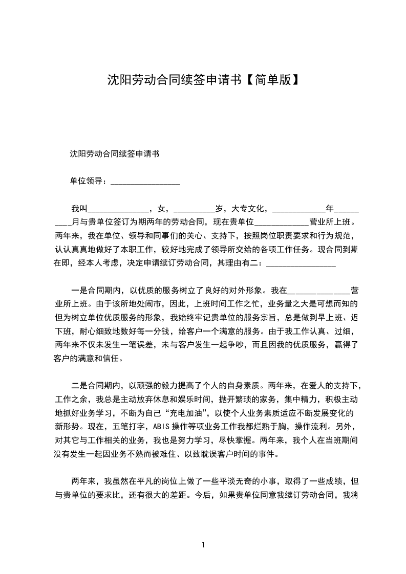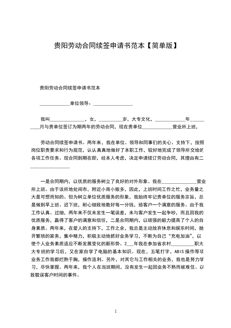 我叫_______________,女,__________岁,大专文化,_____________年__________月与贵单位签订为期两年的劳动合同,现在贵单位_____________营业所上班。两年来,我在单位、领导和同事们的关心、支持下,按照岗位职责要求和行为规范,认认真真地做好了本职工作,较好地完成了领导所交给的各项工作任务。现合同到期在即,经本人考虑,决定申请续订劳动合同,其理由有二:_________________