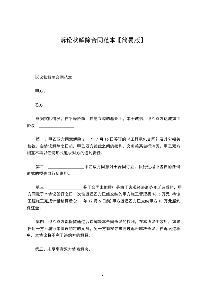 鉴于:_________________甲、乙双方于_____年_____月_____日签订《委托代理合同》,甲方委托乙方指派律师为。现由于其他原因,甲方提出解除委托代理合同。为此,甲、乙双方经过充分协商,达成如下协议:_________________