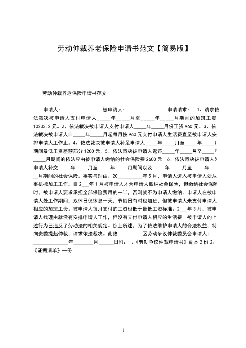 申请人:_________________被申请人:_________________申请请求:1、请求依法裁决被申请人支付申请人_____年_____月至_____年_____月期间的加班工资10233.2元。2、依法裁决被申请人支付申请人_____年_____月份工资960元。3、依法裁决被申请人自_____年_____月起每月按960元支付申请人生活费直至被申请人安排申请人工作止。4、依法裁决被申请人补足申请人_____年_____月至_____年_____月期间最低工资差额部分1200元。5、依法裁决被申请人返还_____年_____月至_____年_____月期间的依法应由被申请人缴纳的社会保险费2600元。6、依法裁决被申请人为申请人补交_____年_____月至_____年_____月期间以及_____年_____月至_____年_____月期间的社会保险。事实与理由:20__________年5月,申请人进入被申请人处从事机械加工工作,自2___年1月被申请人才为申请人缴纳社会保险,但缴纳社会保险时,被申请人要求承担全部保险费用的一半,否则就不为申请人缴纳。申请人在被申请人处工作期间,双休日仅休息一天,节假日有时也加班,但被申请人未支付申请人相应的加班工资。被申请人每月支付的工资也低于最低工资标准。2___年3月,被申请人找理由就没有安排申请人工作,但没有支付申请人相应的生活费。被申请人的上述行为已违反了劳动法的相关规定。综上所述,为了依法维护申请人的合法权益,特向贵委提起仲裁,请求依法裁决。此致__________区劳动争议仲裁委员会申请人:________________年________月______日附:1、《劳动争议仲裁申请书》副本2份2、《证据清单》一份