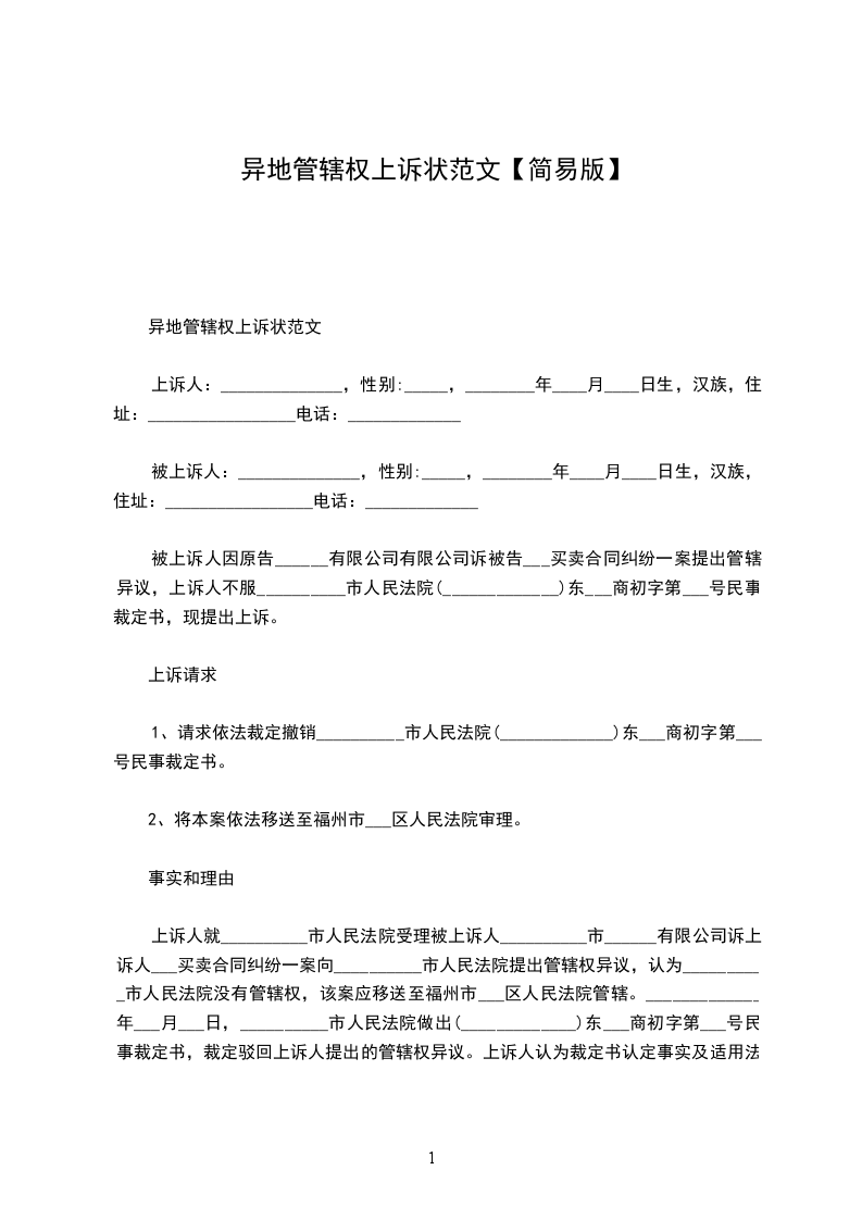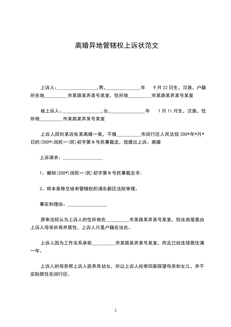 离婚异地管辖权上诉状范文
