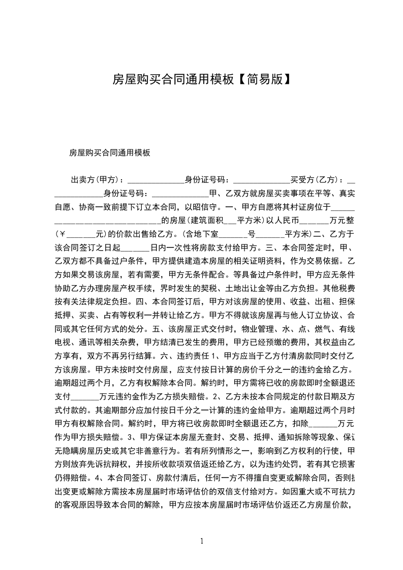 出卖方(甲方):______________身份证号码:______________买受方(乙方):______________身份证号码:______________甲、乙双方就房屋买卖事项在平等、真实、自愿、协商一致前提下订立本合同,以昭信守。一、甲方自愿将其村证房位于_______________________________的房屋(建筑面积___平方米)以人民币_______万元整(¥_______元)的价款出售给乙方。(含地下室_______号_______平方米)二、乙方于该合同签订之日起_______日内一次性将房款支付给甲方。三、本合同签定时,甲、乙双方都不具备过户条件,甲方提供建造本房屋的相关证明资料,作为交易依据。乙方如果交易该房屋,若有需要,甲方无条件配合。等具备过户条件时,甲方应无条件协助乙方办理房屋产权手续,界时发生的契税、土地出让金等由乙方负担。其他税费按有关法律规定负担。四、本合同签订后,甲方对该房屋的使用、收益、出租、担保、抵押、买卖、占有等权利一并转让给乙方。甲方不得就该房屋再与他人订立协议、合同或其它任何方式的处分。五、该房屋正式交付时,物业管理、水、点、燃气、有线电视、通讯等相关杂费,甲方结清已发生的费用,甲方已经预缴的费用,其权益由乙方享有,双方不再另行结算。六、违约责任1、甲方应当于乙方付清房款同时交付乙方该房屋。甲方未按时交付房屋,应支付按日计算的房价千分之一的违约金给乙方。逾期超过两个月,乙方有权解除本合同。解约时,甲方需将已收的房款即时全额退还、支付_______万元违约金作为乙方损失赔偿。2、乙方未按本合同规定的付款日期及方式付款的。其逾期部分应加付按日千分之一计算的违约金给甲方。逾期超过两个月时,甲方有权解除合同。解约时,甲方将已收房款即时全额退还乙方,扣除_______万元作为甲方损失赔偿。3、甲方保证本房屋无查封、交易、抵押、通知拆除等现象、保证无隐瞒房屋历史或其它非善意行为。若有所列情形之一,影响到乙方权利的行使,甲方则放弃先诉抗辩权,并按所收款项双倍返还给乙方,以为违约处罚,若有其它损害仍得赔偿。4、本合同签订、房款付清后,任何一方不得擅自变更或解除合同,否则提出变更或解除方需按本房屋届时市场评估价的双倍支付给对方。如因重大或不可抗力的客观原因导致本合同的解除,甲方应按本房屋届时市场评估价返还乙方房屋价款,并赔偿乙方的房屋装修费用。5、如因政府规划部门、设计部门的原因导致房屋拆除或使用功能变更的,甲方应当通知乙方。如有本房屋的补偿款发放,甲方应即时全额支付给乙方。否则应支付按日计算的补偿款千分之一的违约金给乙方,直至全额支付给乙方日止。七、甲方应及时将可能影响本合同或该房屋价值的任何事件(包括但不限于公司、法人、通讯方式发生改变,该房屋的查封、扣押、诉讼、仲裁或其它争议事件)通知乙方,由于甲方的过错造成房屋价值减少的,甲方应立即采取措施防止损失扩大,并赔偿乙方损失。八、本合同自各方签字或盖章之日起生效,并对双方都具有约束力,应严格履行。本房屋属企业用房,国家政策限制,乙方是实际产权人和实际所有人,而非合法产权人,故本房屋不灭失,该合同永久有效。九、合同履行过程中发生争议,由双方当事人协商解决,协商不成的依法向合同签署地人民法院起诉。十、附件:甲乙双方身份证复印件、该房屋平面设计图。甲方:______________乙方:______________联系地址:__________联系地址:_________联系电话:__________联系电话:________________年_______月_______日