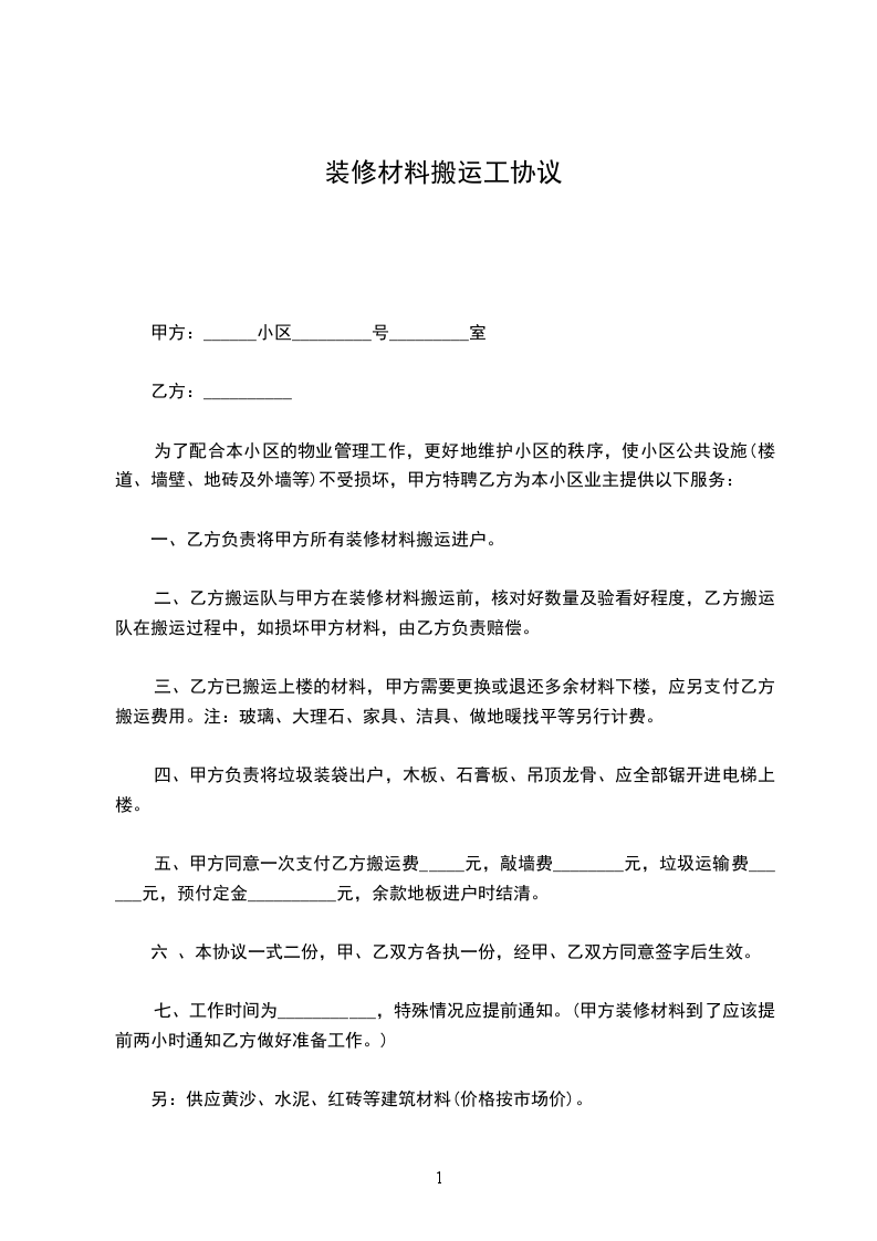 一、乙方负责将甲方所有装修材料搬运进户。