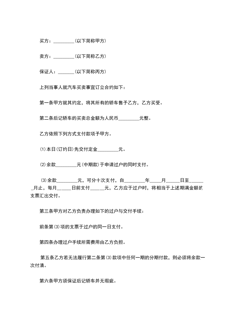 1、协议签订后,卖方需积极、及时的转移车辆的所有权,将车辆交由买方占有、使用。若在约定时间内卖方无故拖延交付或拒绝交付,或是卖方的责任导致车辆在约定之时不能过户,则需向买方支付_______元作为违约金。