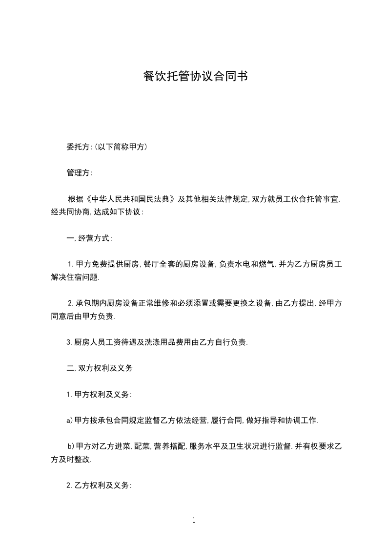 根据《中华人民共和国民法典》及其他相关法律规定,双方就员工伙食托管事宜,经共同协商,达成如下协议: