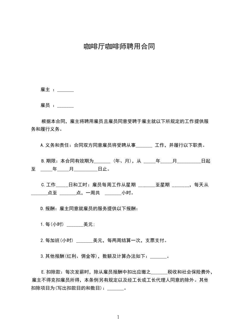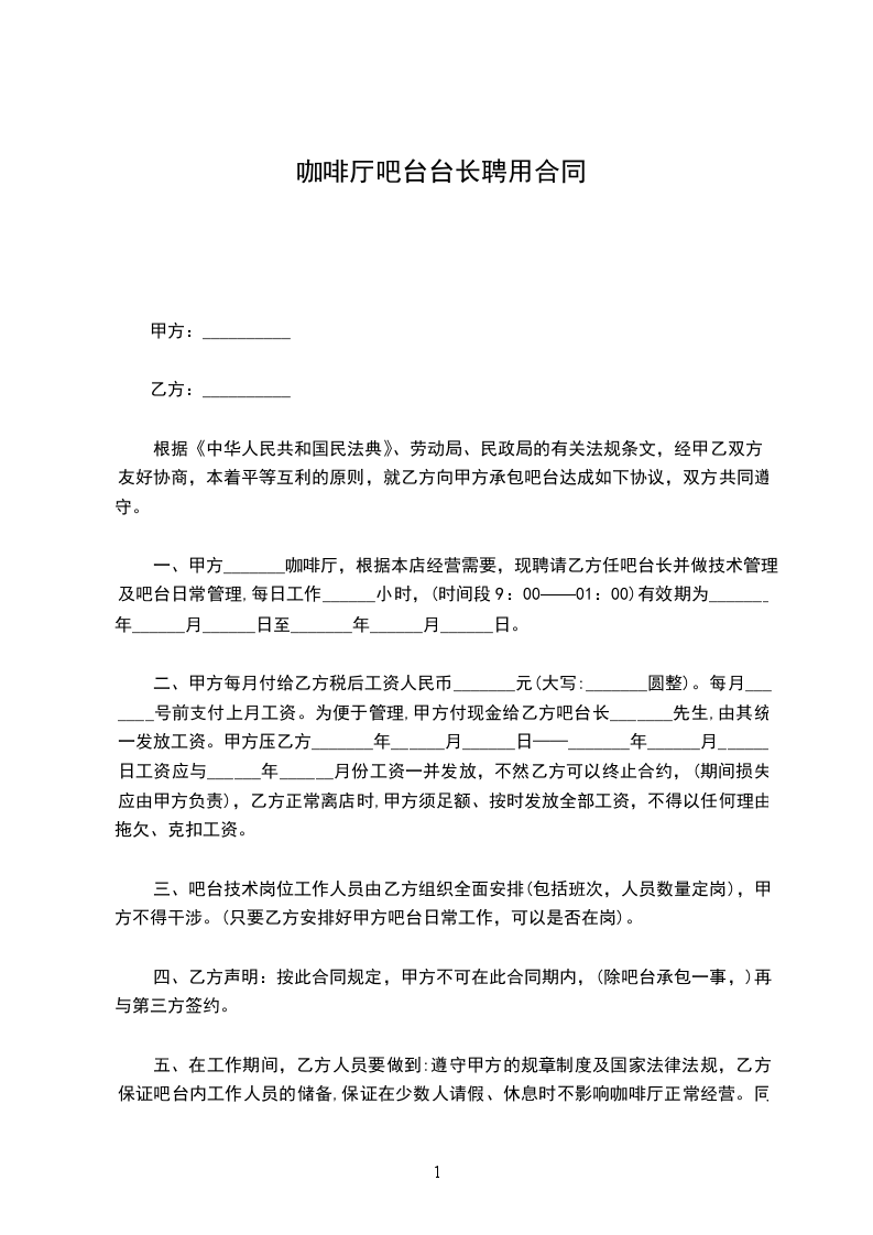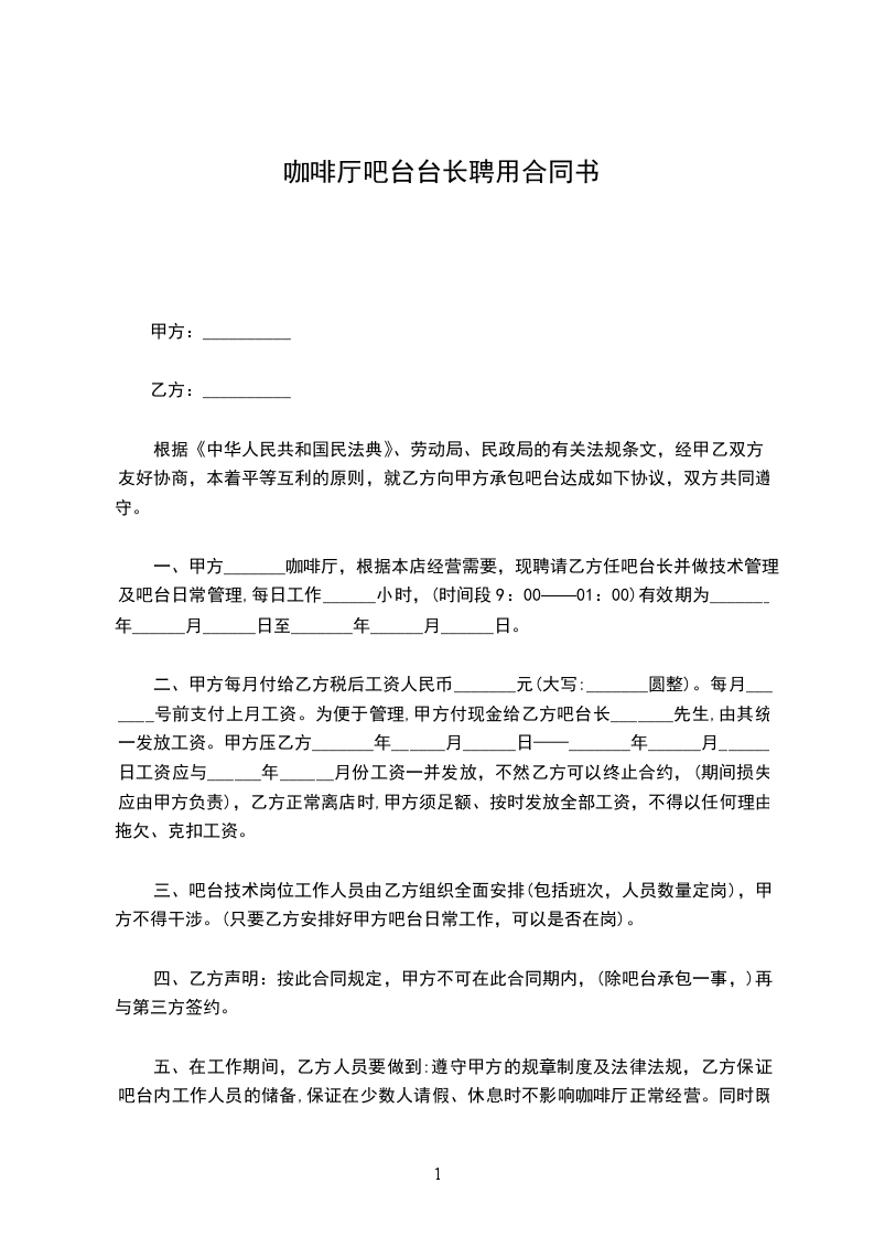 一、甲方_____________,根据本店经营需要,现聘请乙方_____________任吧台长并做技术管理及吧台日常管理,有效期为__年__月__日至__年__月__日。