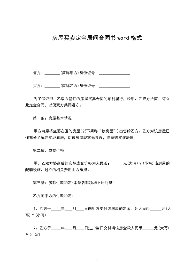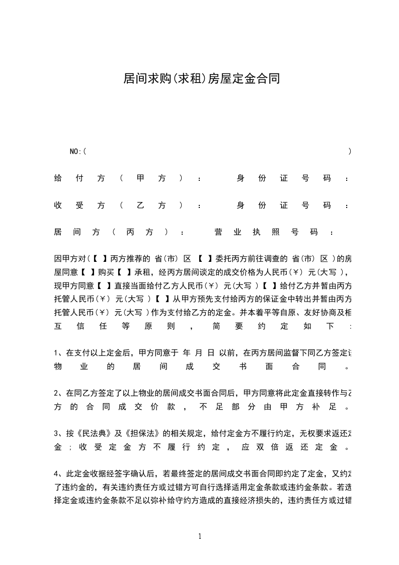 因甲方对(【 】丙方推荐的 省(市) 区 【 】委托丙方前往调查的 省(市) 区 )的房屋同意【 】购买【 】承租,经丙方居间谈定的成交价格为人民币(¥) 元(大写 ),现甲方同意【 】直接当面给付乙方人民币(¥) 元(大写 )【 】给付乙方并暂由丙方托管人民币(¥) 元(大写 )【 】从甲方预先支付给丙方的保证金中转出并暂由丙方托管人民币(¥) 元(大写 )作为支付给乙方的定金。并本着平等自原、友好协商及相互信任等原则,简要约定如下: