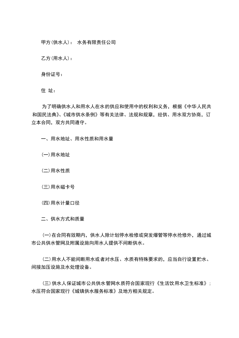 为了明确供水人和用水人在水的供应和使用中的权利和义务,根据《中华人民共和国民法典》、《城市供水条例》等有关法律、法规和规章,经供、用水双方协商,订立本合同,双方共同遵守。
