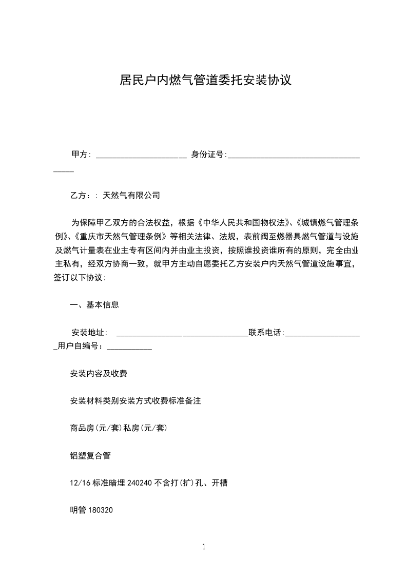 为保障甲乙双方的合法权益,根据《中华人民共和国物权法》、《城镇燃气管理条例》、《重庆市天然气管理条例》等相关法律、法规,表前阀至燃器具燃气管道与设施及燃气计量表在业主专有区间内并由业主投资,按照谁投资谁所有的原则,完全由业主私有,经双方协商一致,就甲方主动自愿委托乙方安装户内天然气管道设施事宜,签订以下协议: