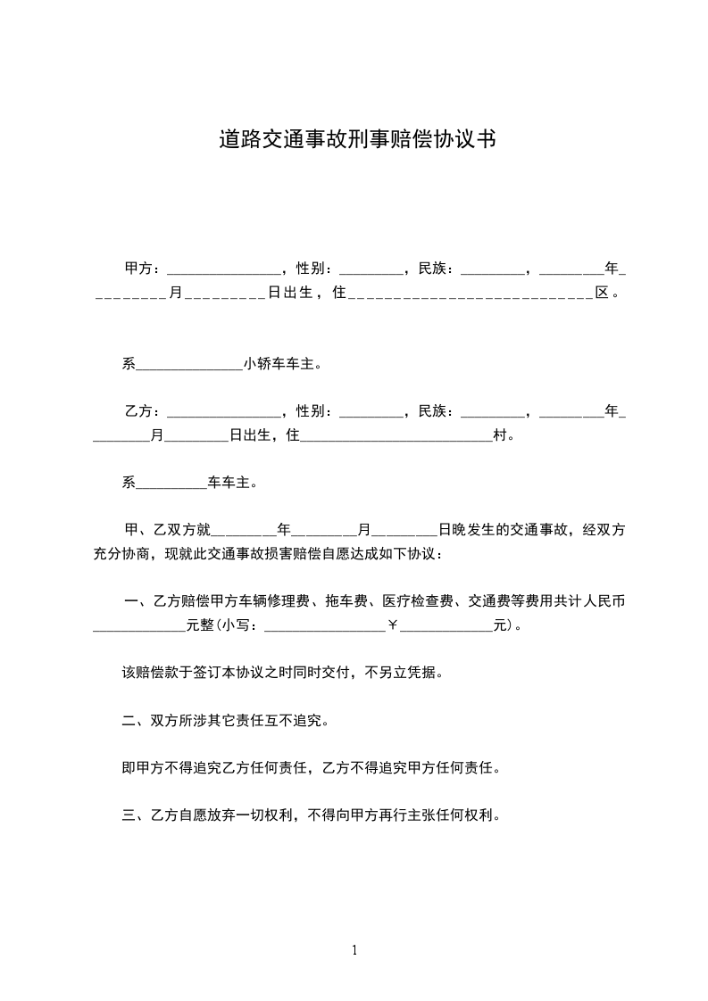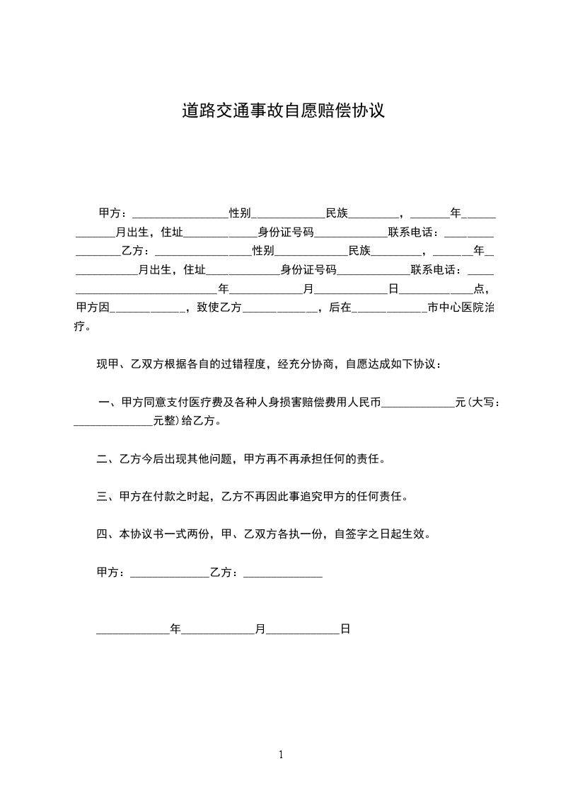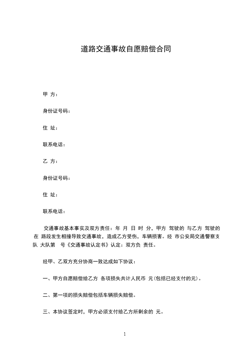 一、甲方自愿赔偿给乙方 各项损失共计人民币 元(包括已经支付的元)。