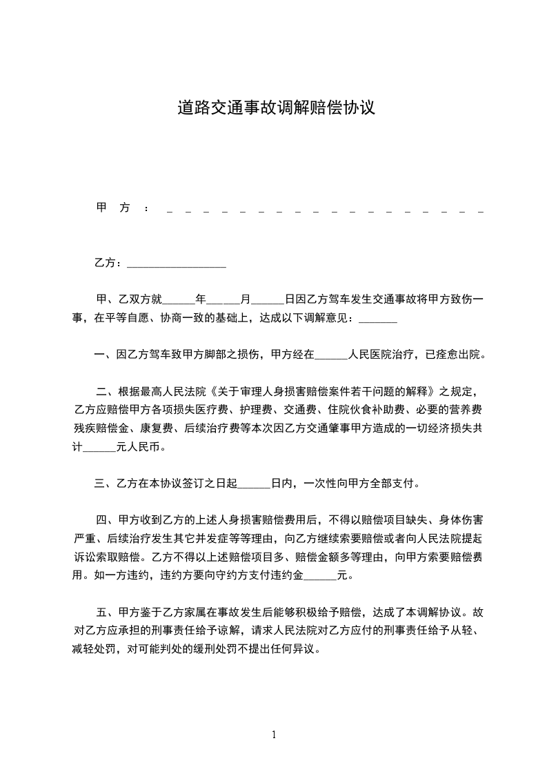 交通事故基本事实及双方责任:年 月 日 时 分,甲方 驾驶的 与乙方 驾驶的 在 路段发生相撞导致交通事故,造成乙方受伤,车辆损害。经 市公安局交通警察支队 大队第 号《交通事故认定书》认定:双方负 责任。
